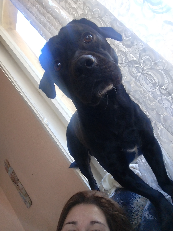 - "This indoor low-angle photograph, taken in Gabrovo, Bulgaria, features a black dog and a partial view of a person" by FM-YvcY33, licensed under CC BY 4.0
