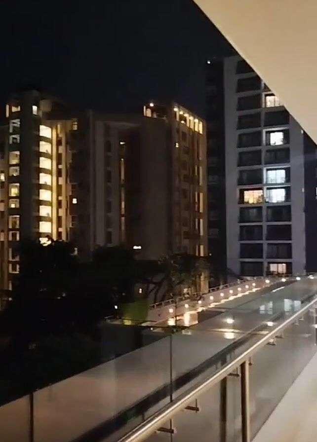 The video depicts a night scene from a high vantage point, likely a balcony or elevated walkway. Several tall buildings are visible, some illuminated with lights on in multiple windows. The camera pans across the scene, showing more buildings in the distance. Below, there is dense foliage, obscuring the ground. The walkway or balcony has a glass railing. The night sky is dark.