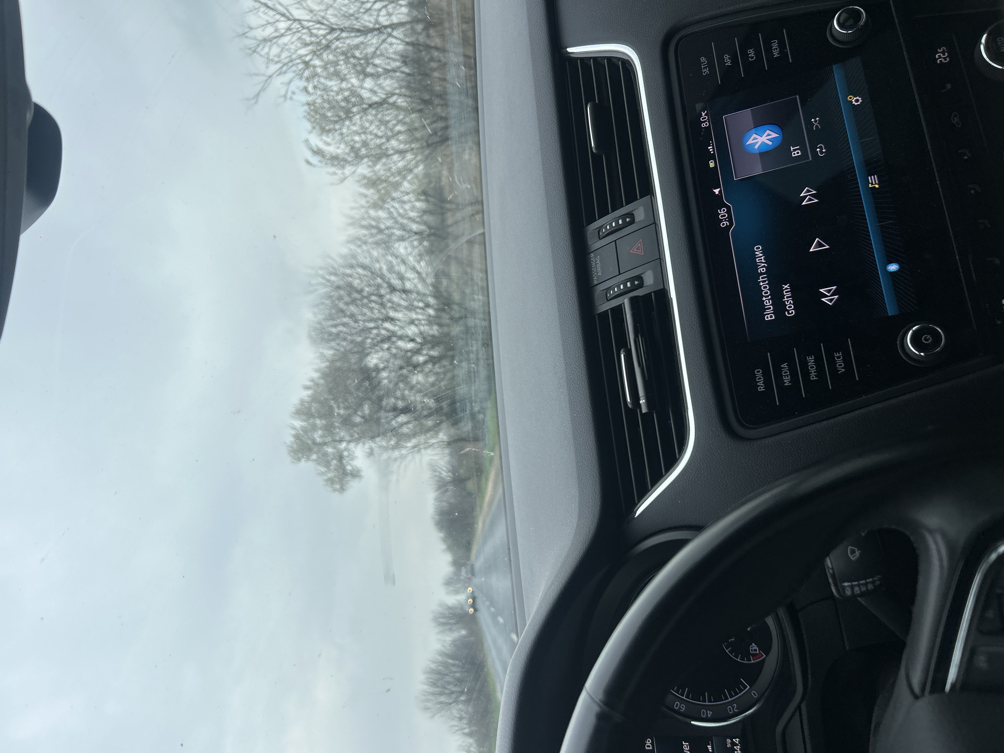The scene depicts an interior view from a moving vehicle, looking forward through the windshield. The location is Graf Ignatievo, Bulgaria. The environment outside the vehicle is characterized by an overcast, light grey sky and a wet, two-lane asphalt road. Bare deciduous trees line both sides of the road, which recedes into the distance. Two vehicles with illuminated headlights are visible ahead on the road. The windshield appears streaked or speckled. Inside the vehicle, a dark-colored dashboard occupies the lower half of the frame. The left side features a portion of a multi-function steering wheel and a partial view of an instrument cluster displaying a "trip" reading of "44.4". The center dashboard contains horizontal air vents, a hazard warning light button, and a "PASSENGER AIRBAG" indicator. A touchscreen infotainment system is prominently displayed in the center console. The screen shows the time "9:06", an external temperature of "8.0°C", and indicates "Bluetooth аудио" (Bluetooth audio) is active, playing a track by "Goshnx". Physical buttons for "RADIO", "MEDIA", "PHONE", and "VOICE" are visible alongside the screen. Below the screen, a cabin temperature of "22.5" is displayed, likely indicating a climate control setting. A rearview mirror housing is partially visible at the top center of the windshield. No individuals are visible in the image.