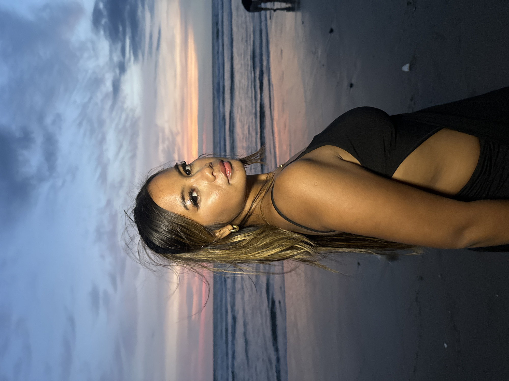 A young adult female, appearing to be of Southeast Asian descent, stands in the foreground on a wet, dark sand beach