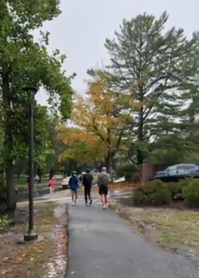 paved pathway winding through a park-like setting on what appears to be a wet, overcast day. Several people are walking along the path, heading away from the camera. There's a light pole to the left, and trees line both sides of the path, with one tree exhibiting yellowing leaves, suggesting it's autumn. A brick structure is visible on the right side behind some foliage, and cars are parked in the distance. Raindrops appear to be visible on the camera lens.