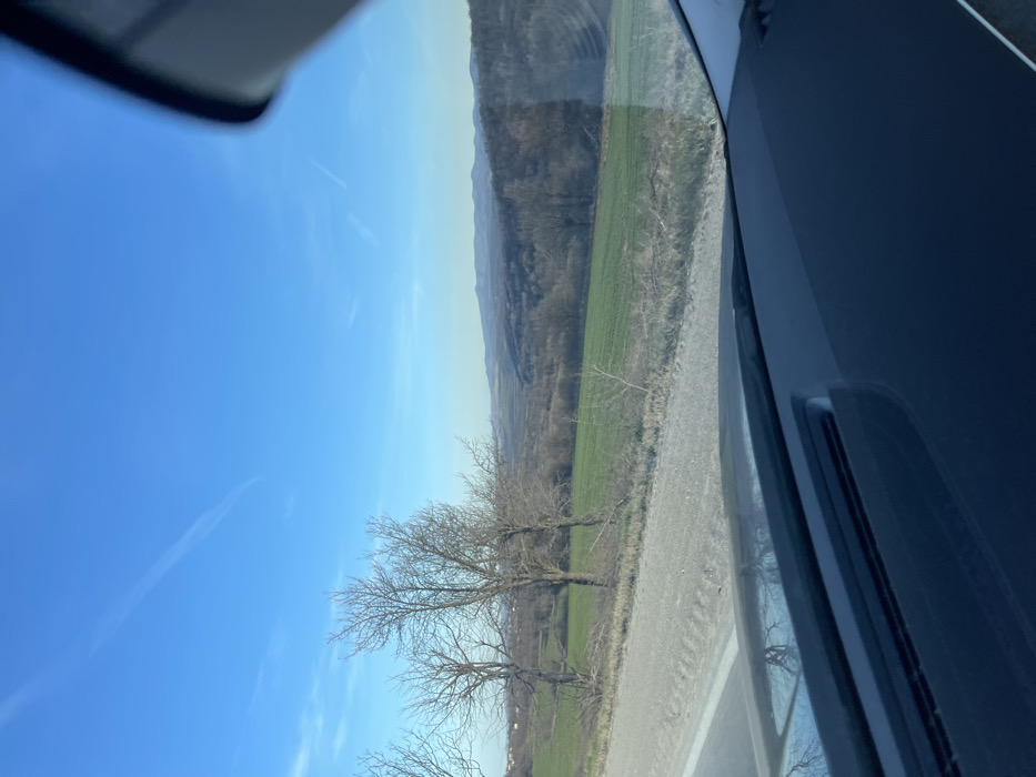 The image captures a rural landscape near Moravitsa, Bulgaria, viewed from the interior of a vehicle