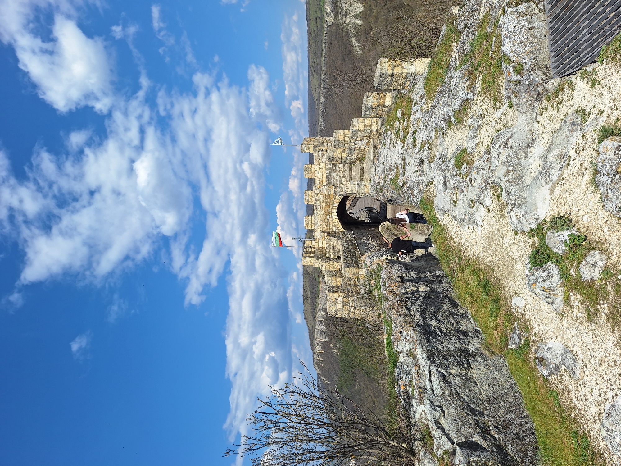 The image depicts the Ovetch Fortress, located in Provadia, Bulgaria. The fortress is constructed of light-colored stone and is situated on a rocky plateau. A Bulgarian flag flies from the fortress. In the foreground, a person is sitting on a stone wall. A blue sky with scattered clouds fills the background.