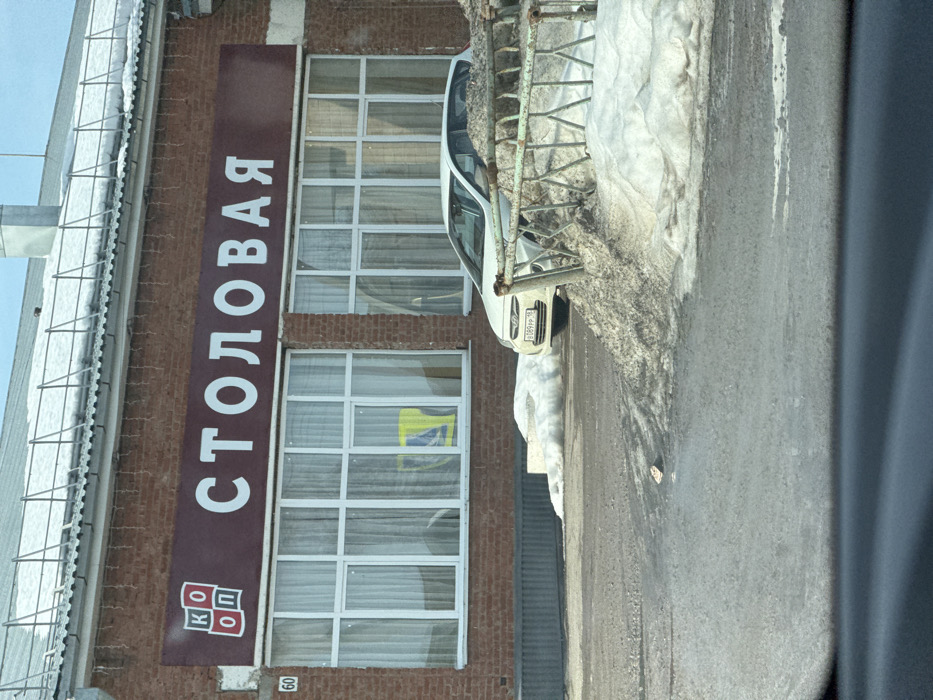 The image depicts an exterior scene in the city of Кварса, Russia, under what appears to be late winter or early spring conditions. The primary subject is a two-story red brick building with a maroon sign board across its facade. The sign displays the white Cyrillic text "СТОЛОВАЯ" (Canteen) and a "КООП" (KOOP) logo to the left. A white number "60" is affixed to the brick wall below the left side of the sign. Below the sign are multiple large windows with white frames and white curtains visible inside. A bright yellow object, possibly a reflective vest or sign, is discernible through one of the windows. The roof of the building is partially visible, covered in snow, with a metal safety rail and icicles hanging from the eaves. A metal chimney or vent pipe extends from the roof. The lower portion of the building facade below the windows is covered with dark grey corrugated metal paneling. In the foreground and midground, a paved surface, likely an asphalt parking lot or driveway, is partially covered with wet slush and ice. A white Hyundai hatchback, bearing Russian license plate "B 089 PP 18," is parked facing left in front of the building. Adjacent to the vehicle and closer to the foreground is a large pile of dirty, melting snow and slush, mixed with what appears to be debris. A rusted, light green metal barrier or fence is partially visible, partially obscured by the snow pile. Patches of cleaner snow are present closer to the building's foundation. A small, light-colored piece of debris lies on the wet asphalt surface in the mid-foreground. No people are visible in the scene. The sky above the building is clear and blue.
