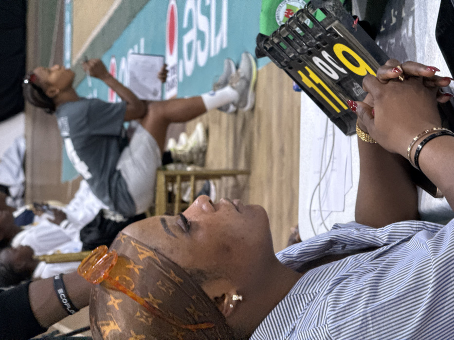 The scene is set indoors at a sports facility in Iganmu, Nigeria, likely a gymnasium or basketball court, identifiable by the light brown wooden floor and a teal-green court surface with white markings. In the foreground, a woman with dark skin and long eyelashes is seated, oriented in profile looking rightward out of the frame. She wears a brown headwrap patterned with the "LV" (Louis Vuitton) monogram, with a translucent orange object, possibly the arm of sunglasses, resting on top. She is dressed in a light blue and white striped collared shirt, and wears small stud earrings – one diamond-like and one silver-toned. Her left wrist displays a gold-toned watch or bracelet, while her right wrist has multiple bracelets, including one black with white accents and another gold-toned. Her fingernails are painted red with white polka dots. Her hands are clasped over a black flip score indicator displaying the numbers "1109". A black smartphone is partially visible beneath her right hand. On a white surface in front of her, papers with drawn lines and what appears to be electrical wiring are visible. To the right, a green object, possibly a banner or mat, is partially seen. In the mid-ground, slightly behind and to the right of the foreground woman, another woman with dark hair tied back sits on a light brown wooden stool. She wears a dark grey t-shirt, light grey shorts, white socks, and grey athletic shoes, and holds a clipboard and pen, also looking out of frame to the right. Further back, several blurry figures are visible, some seated on similar wooden stools. One individual on the far left wears a black armband with "ECOFLO" printed on it.