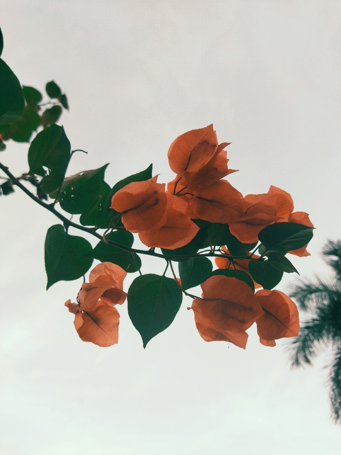- "A branch bearing vibrant orange bougainvillea flowers and green leaves extends across the frame" by FM-6IJBE3, licensed under CC BY 4.0