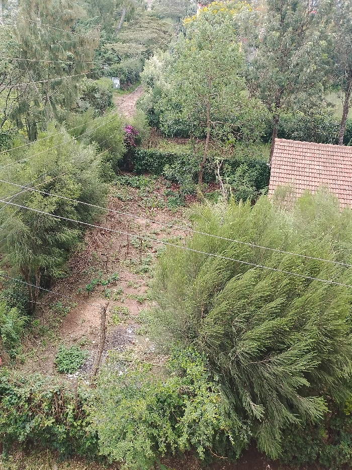 The image displays an elevated view of a sloped, vegetated landscape in Olkeri ward, Kenya. The central area features a cleared, unpaved section of reddish-brown earth with sparse ground cover and small, young plants arranged in rudimentary rows, indicating cultivation. An unpaved dirt path winds uphill and into the distance through dense green foliage in the upper-left and mid-ground. On the right side, the reddish-brown tiled gabled roof of a building is partially visible, mostly obscured by surrounding trees. Multiple thin, light-colored utility wires traverse horizontally across the mid-ground, passing over trees and the cleared area. The scene is dominated by various types of green trees and shrubs, including tall evergreens and dense bushy foliage. A patch of purple bougainvillea is visible among the greenery in the mid-left. No people or animals are present.