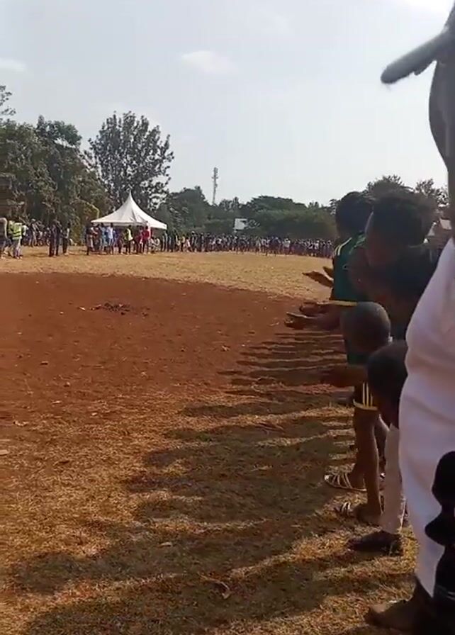 crowd of people watching a race on a dirt field. The camera is positioned behind a group of onlookers, and the focus is on the runners in the distance. There is a white tent and a group of spectators near the finish line. The sky is partially cloudy.