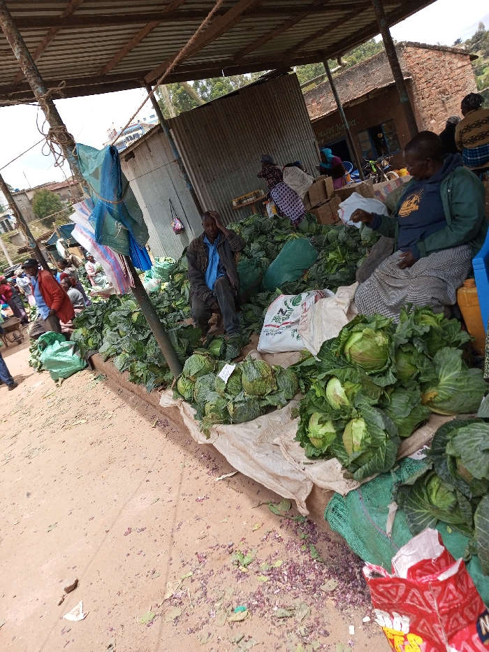 This image depicts an open-air market stall in Ithemboni, Kenya, specializing in fresh produce. The scene is dominated by large quantities of green cabbages, piled directly on the reddish-brown dirt ground and on light-colored tarpaulins or sacks. A makeshift structure with a corrugated metal roof, supported by wooden beams and poles, provides shade. In the foreground to the right, an adult female wearing a dark green hooded jacket and a patterned skirt is seated on a blue plastic container behind a substantial cabbage display. She appears to be handling produce. To her left, an adult male in a blue shirt and dark jacket is seated amidst the cabbages, with his right hand resting on his forehead. Green mesh bags containing additional produce are visible near both individuals. The unpaved ground exhibits scattered organic debris, consistent with vegetable market activity. In the background, numerous other individuals are visible, some pushing a handcart, indicating a busy market environment. Behind the stall, various buildings are present, including one made of corrugated metal and another with stone walls, partially obscured. A multi-story building can be seen further in the distance on the left. Natural daylight illuminates the scene.