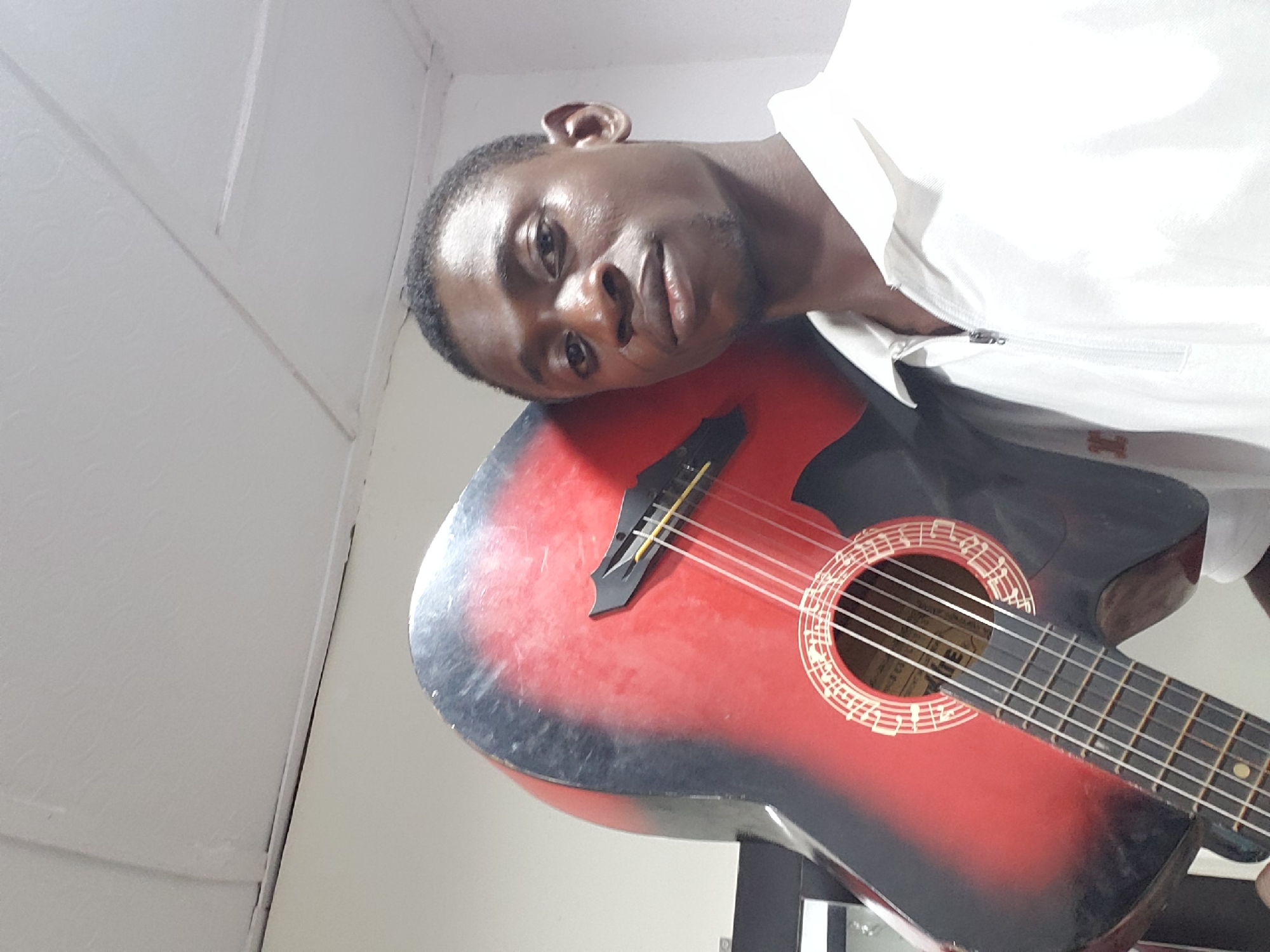 A young Black male is depicted indoors, positioned slightly right of center, looking directly at the camera with a neutral expression. He wears a white collared shirt with a partial zipper. An acoustic guitar is held vertically, resting against his left shoulder and partially obscuring his left side. The guitar features a red and black sunburst finish with visible wear, six strings, and a soundhole adorned with a white musical note rosette pattern. The background consists of plain, light-colored walls and a white paneled ceiling with visible seams and some discoloration at the wall-ceiling junction. No specific identifying details regarding the city or precise location are discernible from the image.