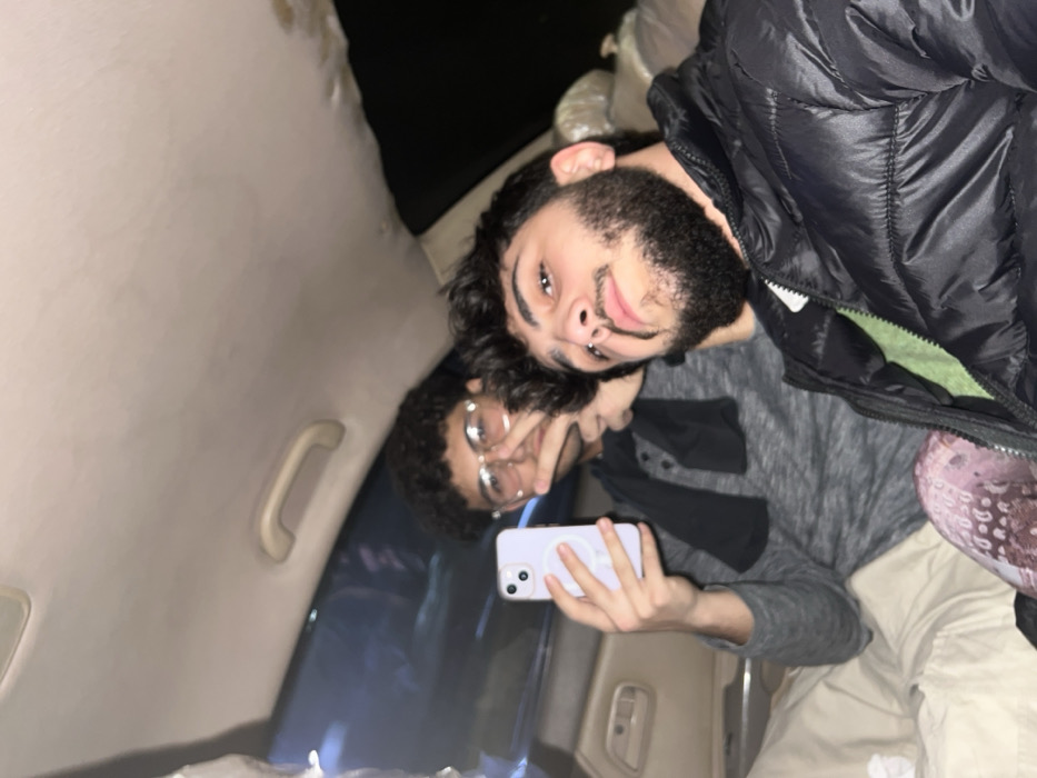 Two young men pose for a selfie inside a vehicle. The one holding a light purple smartphone flashes a peace sign. Both have dark hair and facial hair. The interior is pale, featuring a door handle and tattered headliner. One is wearing glasses, while the other sports a dark puffer jacket. The image is rotated counter-clockwise.
