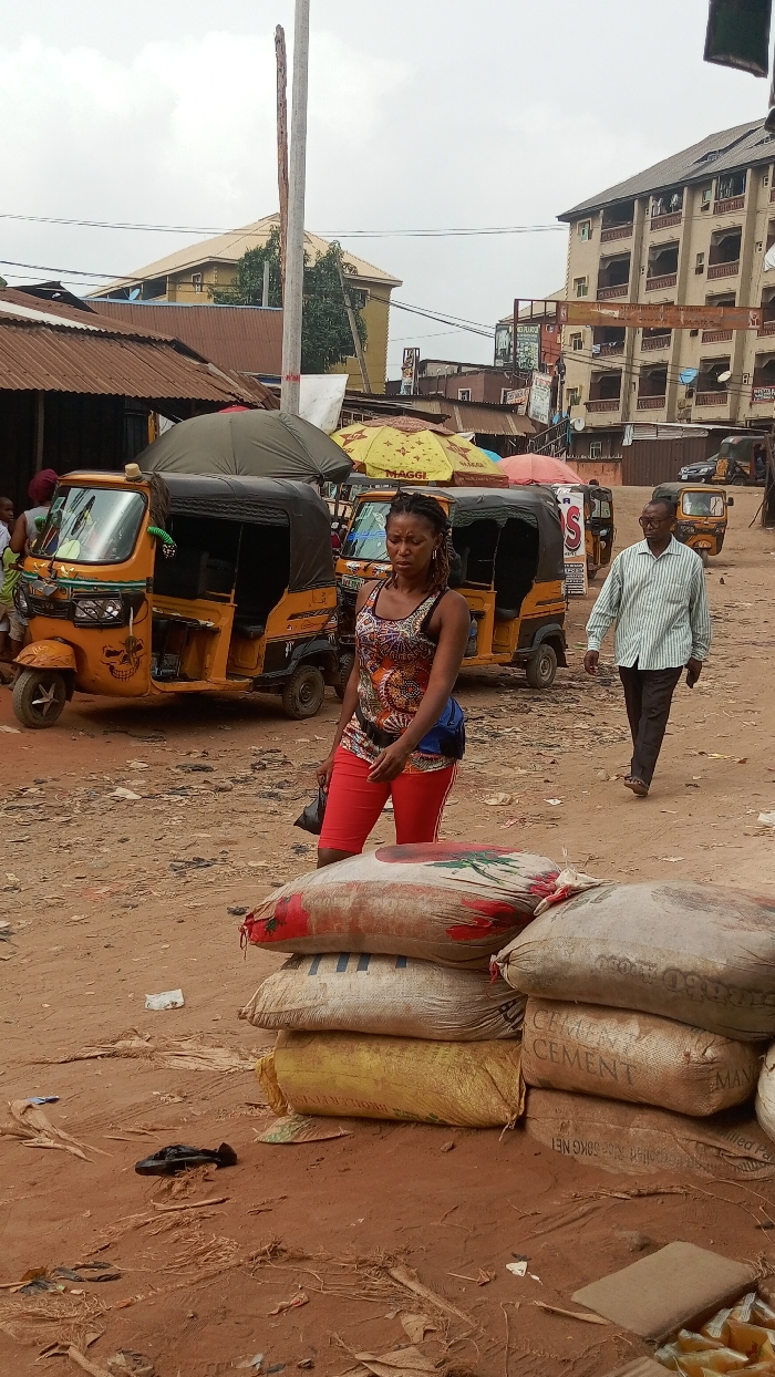 - "The image depicts an unpaved, reddish-brown dirt thoroughfare in Onitsha, Nigeria, under an overcast sky" by FM-BAPtL2, licensed under CC BY 4.0