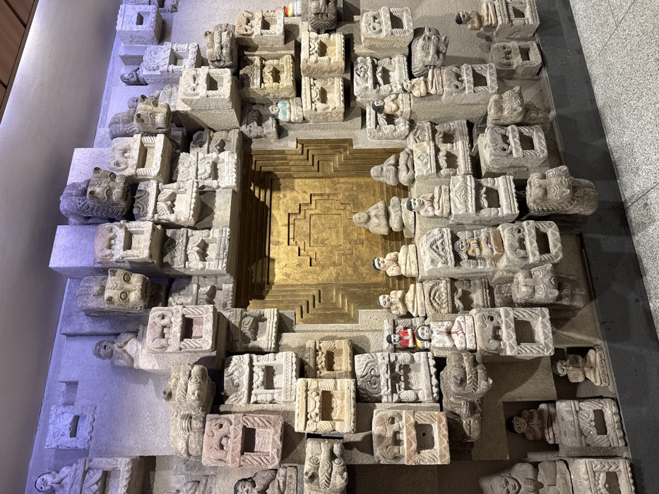 The image displays an intricate wall installation located in Mumbai, India, likely within a museum or cultural institution. The scene is dominated by a dense arrangement of numerous carved stone blocks, primarily light gray and cream-colored, forming a multi-layered, three-dimensional relief. These blocks vary in size and shape, featuring carvings of stylized animal heads, possibly felines or mythical creatures, geometric patterns, and small, recessed niches. Integrated throughout the installation are numerous small, seated statuettes made of stone or ceramic, uniformly depicted in meditative or reverential postures with hands clasped, some exhibiting minor painted details in red and black. A prominent, centrally located, recessed rectangular panel, finished in a reflective gold material with a symmetrical, stepped relief pattern, serves as a focal point. The upper sections of the installation are illuminated by ambient lighting that casts a blue-purple hue. The floor in the immediate foreground is a dark, featureless surface.