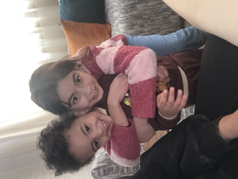 Two smiling girls are huddled together on a couch. The older girl has long brown hair and wears a brown shirt with a pink and white striped sweater. The younger girl, positioned beneath her, has curly dark hair. They appear to be playfully posing for the camera. The couch has several throw pillows, including teal and orange. Someone wearing black pants is partially visible on the right side of the frame.