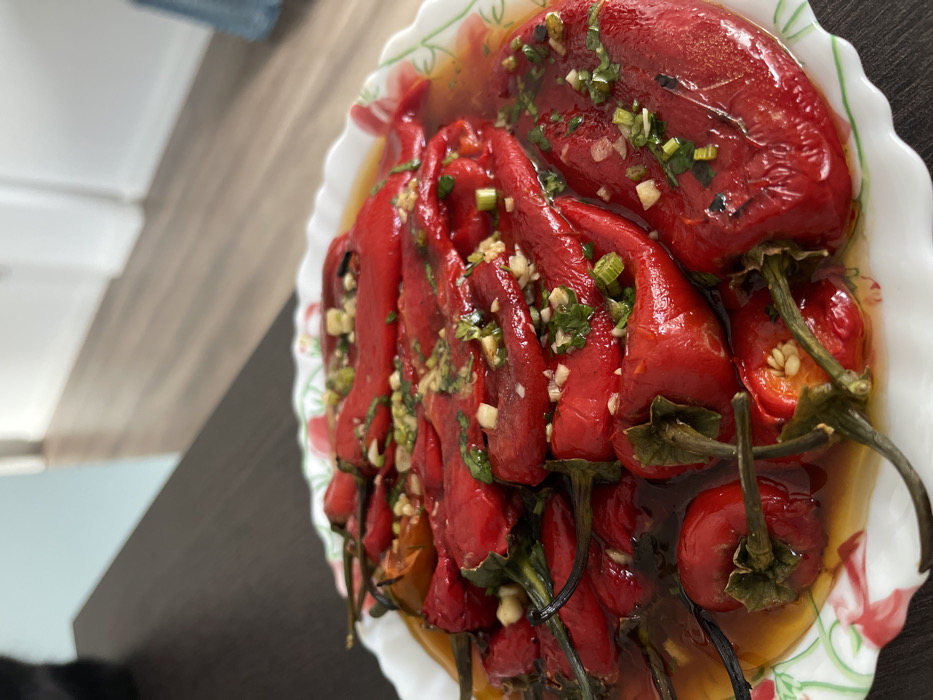 The image displays a close-up, elevated view of a prepared dish situated on a table in Paiporta, Spain. The primary subject is a white, scalloped-edge plate filled with numerous red bell peppers, or similar long red peppers, immersed in a translucent, reddish-brown liquid. Many peppers retain their green stems, and some show minor charring on their skins. The peppers are garnished with finely chopped white garlic pieces and green herbs, possibly parsley or chives, scattered over their surface and within the liquid. One pepper towards the lower center is partially open, revealing internal seeds. The plate features a subtle floral design along its rim, composed of red and green elements. The plate rests on a dark, horizontal surface, likely a wooden table or countertop. The background is out of focus, revealing a light blue wall on the left, a white door frame and closed door centrally, and a light brown wooden floor extending from the door. No individuals or specific actions are visible.