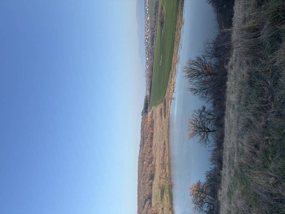 The image depicts an expansive rural landscape near Muldava, Bulgaria, viewed from an elevated vantage point. The upper third of the frame is occupied by a clear, light blue sky. The immediate foreground shows a slope covered in dry, light brown and gray grasses with some sparse, bare scrub and tree branches at the very bottom. Below the foreground slope, a body of dark blue water, likely a lake or reservoir, extends across the midground. The water's surface is mildly textured, reflecting the sky. Several bare deciduous trees with visible branch structures are positioned along the near edge of the water. On the far side of the water, a large area of defoliated, brown trees covers a hill to the left, indicating a woodland. Adjacent to this wooded area and bordering the water to the right, a strip of lighter brown, reedy vegetation is present. Further to the right, beyond the water and vegetation, a large, vibrant green agricultural field is visible, curving towards the background. A small, circular patch of uncultivated brown land is situated within this green field. In the distant background, a cluster of residential structures with reddish-brown roofs forms a discernible village or town, which is identified as Muldava, Bulgaria, positioned along the far edge of the green field. Beyond the settlement and fields, hazy blue mountains are visible on the horizon, merging with the atmosphere. No individuals or specific actions are observed in the scene.