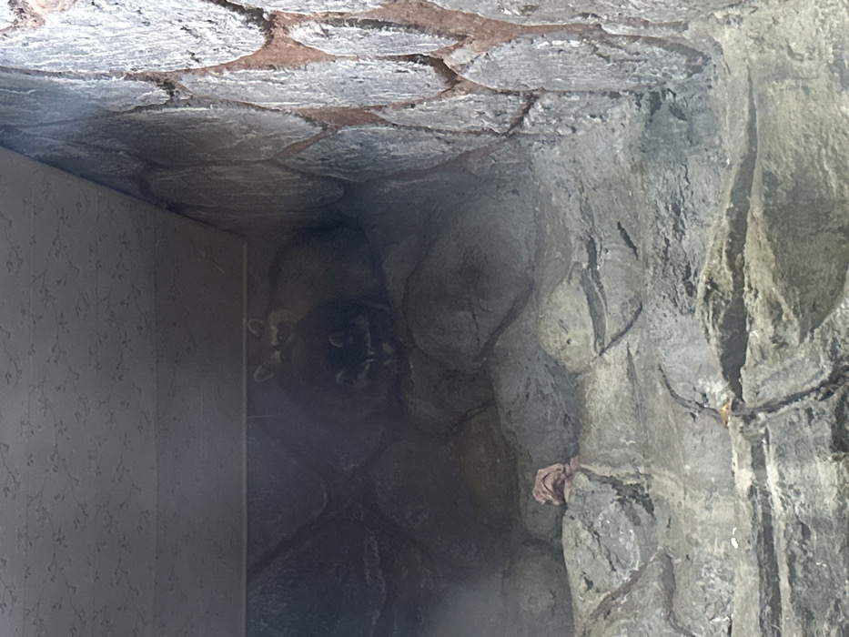 The image presents an interior view of an animal enclosure within the city of Sarouja Municipality, Syria. Two raccoons are resting within a dark rock alcove formed by artificial grey stone structures. The front raccoon's masked face is visible, looking forward, with a second raccoon partially obscured behind it, its head visible to the right. A light-colored, patterned ceiling is visible overhead, and the right side features a vertical wall constructed from light grey artificial stones separated by reddish-brown mortar. A lower tier of grey artificial rock ledges presents a small, reddish-pink organic object on a central platform. No human subjects are present in the scene.