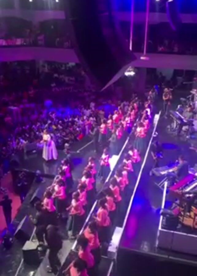 n overhead view of a large performance stage with a choir arranged in neat rows. The choir members are wearing pink tops and dark skirts. In front of the choir stands a woman in a long, light-colored gown. To the side of the choir is a musical ensemble with instruments including keyboards and guitars. There are people standing near the instruments, presumably musicians. The stage is brightly lit with a combination of purple, blue, and white lights. The audience is visible in the background, a densely packed crowd. Large, black speaker arrays hang above the stage. The atmosphere appears to be that of a concert or a religious service with musical performance. A few people are walking between the rows of the choir. The video gives the impression of a large, well-attended event.