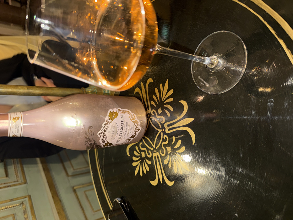 A bottle of "Alfred Gratien Cuvée Paradis Brut Rosé 2008" champagne lies horizontally on a black table with gold floral accents