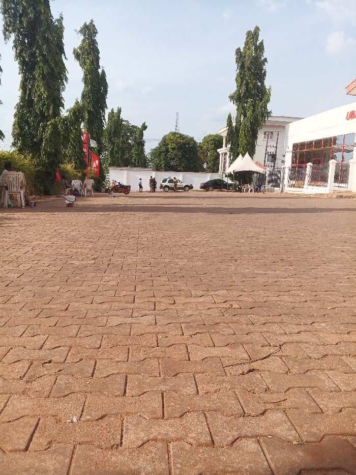 The image depicts the exterior of a UBA bank branch in Nsukka, Nigeria, under a clear daytime sky. The foreground consists of a large expanse of reddish-brown interlocking paver blocks, showing wear and dust accumulation. To the left, a cluster of tall, slender evergreen trees and green shrubbery borders the paved area. Beneath these trees, several white plastic chairs are arranged, with approximately three individuals seated or standing nearby. A white bucket rests on the ground. In the midground, a white perimeter wall runs horizontally, separating the open paved area from the buildings behind it. Adjacent to this wall, from left to right, a red motorcycle is parked, followed by a silver SUV and a dark sedan. Near the vehicles, several individuals are standing; at least two are visibly uniformed, one appearing to carry a firearm. Further to the right, a white pyramidal tent with a dark frame provides shade, under which multiple individuals are seated on chairs. The main building on the right is a white structure identified as a UBA bank branch by prominent red "UBA" signage. It features large, dark-tinted windows. Behind this, another white multi-story building with a dark roof and a visible antenna-like structure can be seen, partially obscured by more tall evergreen trees. Approximately 10-15 individuals are present throughout the scene, primarily in groups, either seated, standing, or interacting within the immediate vicinity of the bank and adjacent public areas.