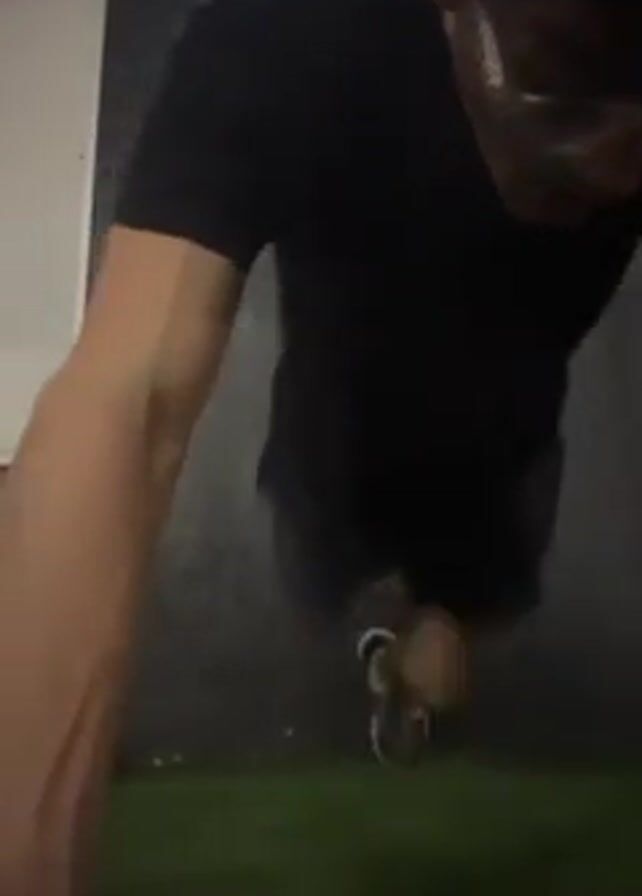 A slender man with curly dark hair and glasses wearing a black T-shirt and dark shorts is performing a handstand against a gray wall with a whiteboard on it. He's balancing on his hands on what appears to be artificial green turf.