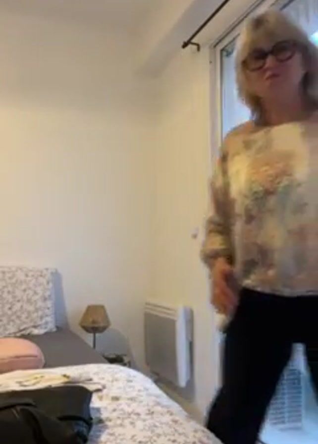 A blonde woman wearing glasses, a floral blouse, and black pants stands in a bedroom and poses for the camera. The room has a bed with patterned bedding, a nightstand with a lamp, and a sliding glass door leading to a balcony. The woman first adjusts her blouse, then does a playful gesture with her hands before placing them in her pockets and smiling.