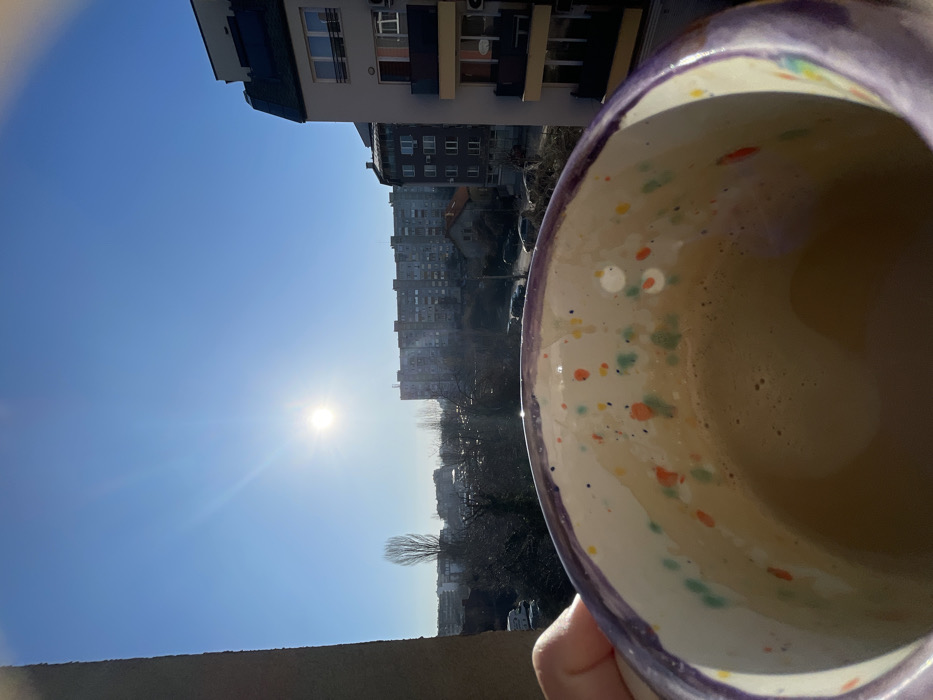 The image displays an urban residential panorama in Sofia, Bulgaria, captured on a clear, bright sunny day from an elevated vantage point. In the lower left foreground, a hand holds a ceramic mug with a purple rim and a white interior splattered with multi-colored speckles (orange, green, yellow, blue, red). The mug contains a light brown, foamy beverage. The background features a vibrant blue sky with the sun shining brightly in the upper left-center, creating a lens flare effect. The urban landscape consists of several buildings. On the immediate right, a multi-story, modern apartment building with a dark sloped roof, light grey and white facades, balconies, and visible air conditioning units is present. Further in the midground, a street with multiple parked vehicles (sedans, SUVs) is discernible, partially obscured by bare deciduous trees. Behind these trees and vehicles, a prominent line of large, multi-story, grey, pre-fabricated panel apartment buildings, characteristic of socialist-era construction, stretches across the horizon. Scattered between these primary structures are smaller buildings with reddish-brown roofs. The scene depicts a typical residential district within Sofia, characterized by a mix of architectural styles under clear skies.