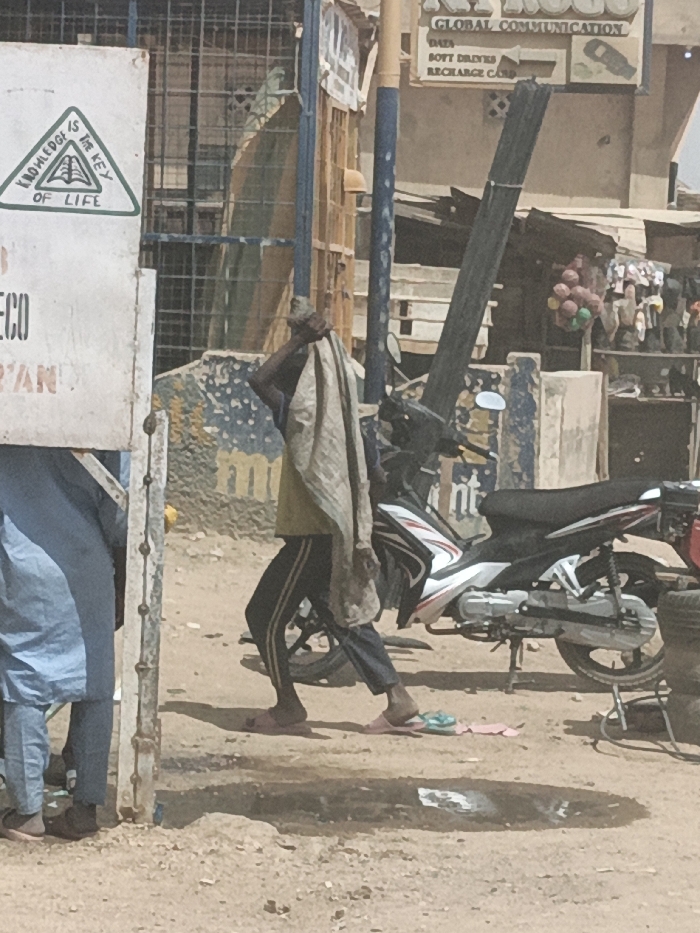 This image depicts a daytime street scene in Hotoro South, Nigeria. The foreground consists of uneven, light brown dirt ground, featuring a small, dark puddle towards the bottom center. A central individual, wearing a light yellow shirt, dark blue track pants with two white side stripes, and light pink flip-flops, is positioned with a light-colored, patterned fabric draped over their head and right shoulder, obscuring their upper body and face. Their left hand appears raised to secure the fabric. A second individual is partially visible on the far left, from the waist down, wearing light blue trousers and dark footwear, standing behind a large white sign. To the left, a portion of a white rectangular sign displays a green triangular emblem with an open book and the text "KNOWLEDGE IS THE KEY OF LIFE." Below this, partially legible text reads "ECO" and "AN." A dark vertical pole runs beside this sign. Behind the central figure, a white, red, and black motorcycle is parked on its kickstand, facing left. The background features various structures and commercial activity. A building facade with faded blue and yellow paint patterns is visible behind the motorcycle. Further right, a shop front displays merchandise, including bags of colorful, spherical items and various footwear. A partially visible sign above reads "GLOBAL COMMUNICATION" with smaller text mentioning "DATA," "SOFT DRINKS," and "RECHARGE CARD." A long, dark wooden beam leans diagonally against a structure in the background. Multiple vertical poles (one dark blue with white flecks, others lighter) and metal grates are also present. The scene is brightly lit by direct sunlight, casting distinct shadows.