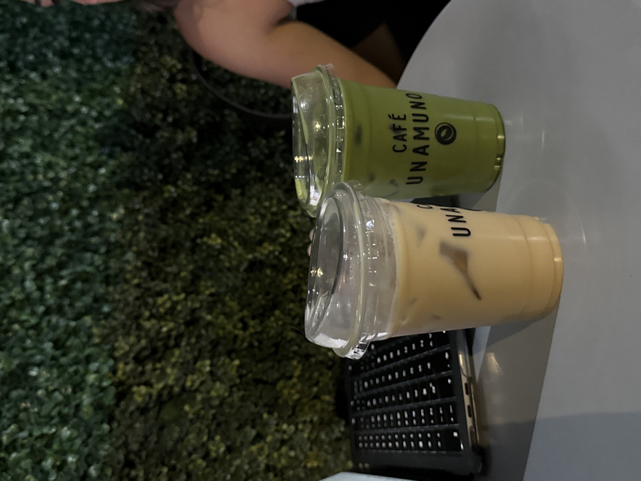 The image displays two plastic beverage cups on a light-colored table at Café Unamuno, located at Calzada San Pedro 217, Del Valle, 66220 San Pedro Garza García, N