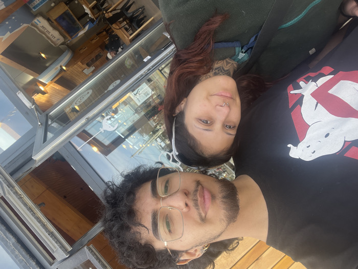 A daytime selfie photograph depicts two individuals, a male and a female, positioned in the foreground. The background reveals the exterior and interior of a commercial building in Tolhuin, Argentina. The male, situated to the left, has dark, curly hair, a beard, a mustache, and wears gold-framed eyeglasses. He exhibits a septum piercing and multiple ear piercings. He is dressed in a black t-shirt featuring a white Ghostbusters logo. His expression is a slight smile. The female, positioned to the right, has reddish-brown hair and visible facial piercings, including a septum ring and a nostril stud. Intricate black ink tattoos are visible on her neck, extending to her collarbone, and partially on her right forearm. She wears a dark green fleece jacket. Her expression is also a slight smile. The background consists of the building's facade, featuring light-colored wooden slats at the top. Below, large glass panels framed in dark material provide a view into the interior. Reflections on the glass show elements of the sky and internal lighting. Inside, wooden walls and ceiling are visible, along with multiple dark chairs, wooden tables, and pendant light fixtures. A prominent banner or poster with Argentine flag colors and the text "ARA SAN JUAN" is displayed inside the establishment. Other smaller Argentine flag elements and logos, including a light bulb graphic, are also visible through the glass. The scene is located in Tolhuin, Argentina, indicating a public or commercial setting such as a cafe or restaurant.