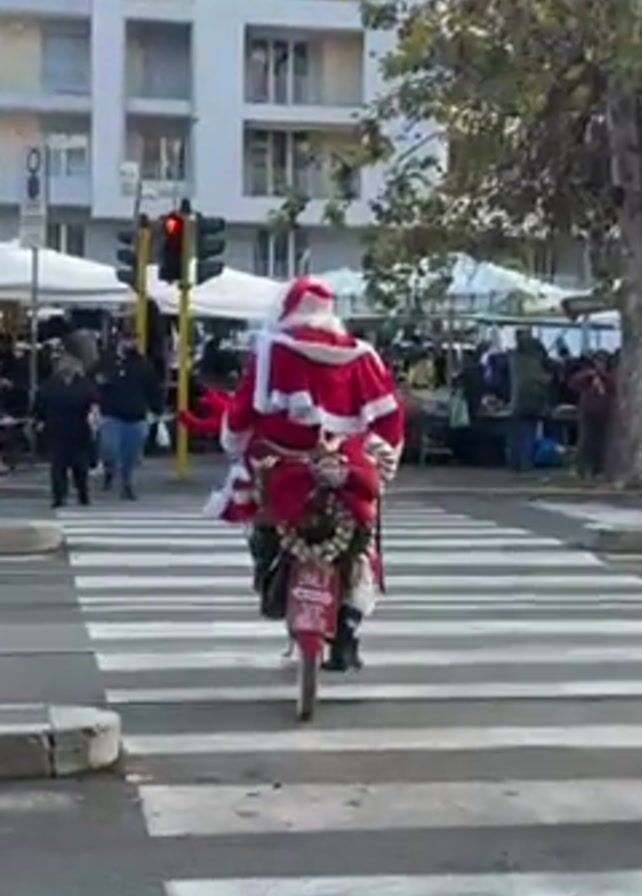 person in a Santa Claus costume riding a small red bicycle across a crosswalk. The bike is decorated with Christmas decorations. The person waves their hands as they ride across the street. In the background, there are people walking near market stalls. There are buildings and trees visible as well. The traffic light is red.