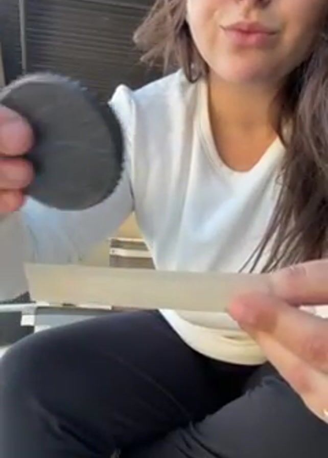A woman with brown hair and a nose ring is shown from the waist up, seated cross-legged outside. She wears a white long-sleeved shirt and black leggings. She holds a rectangular rolling paper in one hand and a black, round grinder lid with "HERCULES" written around a cannabis leaf design in the other. She pours a brownish powdery substance from the grinder lid onto the rolling paper.