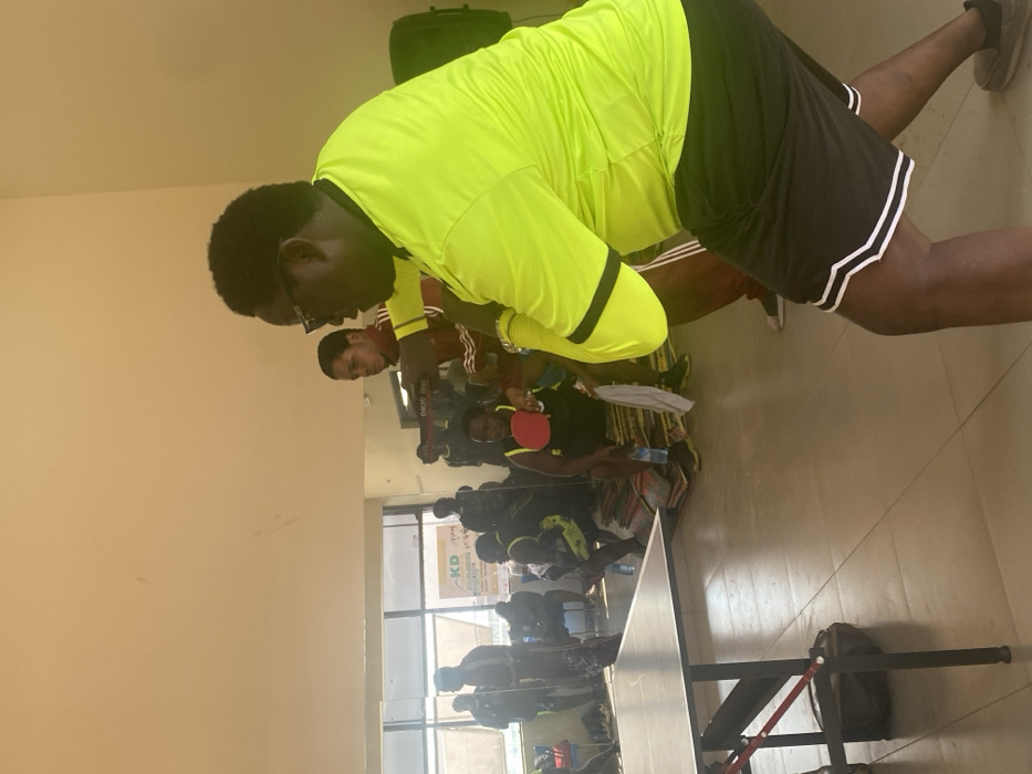 An indoor scene in Unguwar Sarki, Nigeria, displays multiple individuals engaged in or observing a table tennis activity within a brightly lit room. In the immediate foreground on the right, a dark-skinned male, wearing a neon yellow-green short-sleeved shirt with black arm stripes, black athletic shorts with white trim, and glasses, is positioned in an athletic stance, leaning forward to his left. A dark-colored table tennis table is partially visible on the left side of the foreground, with a red strap and a dark bag present underneath it. In the midground, directly behind the foreground subject, a second dark-skinned male wears a dark red long-sleeved shirt with white Adidas stripes on the sleeves and dark pants; he holds a dark, paddle-like object directed towards the left. To his left, a third dark-skinned male is seated on stacked, colorful patterned textiles, holding a red table tennis paddle in his right hand. A plastic water bottle is positioned on the floor near his feet. Additional indistinct figures are present in the background, some seated, near large windows that provide significant natural light. A yellow sign featuring the letters "KD" is visible through the windows. A dark speaker or similar equipment is partially visible on the far right edge of the frame. The room features light-colored walls and a light-colored tiled floor.
