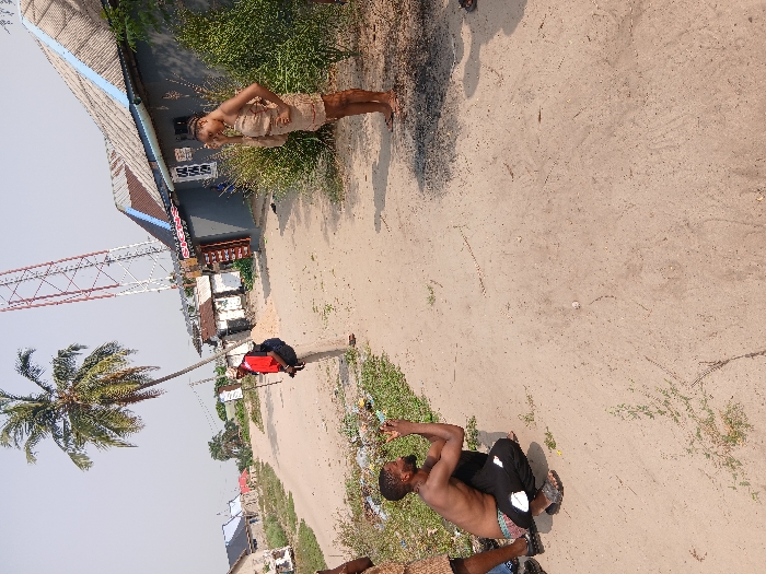 The image depicts an outdoor scene in Unknown, Nigeria, on an unpaved, sandy-colored road under a clear, light-blue sky. Three individuals are prominent. In the foreground, left of center, a dark-skinned male is in a deep squatting position, facing right. He is shirtless, wearing black pants with a patterned waistband and dark sandals. His hands are raised and clasped or gesturing. To his immediate left, the lower legs and feet of another individual, wearing blue pants and dark shoes, are partially visible. In the mid-ground, slightly behind and to the left of the squatting male, a dark-skinned male stands facing right. He wears a red long-sleeved shirt, light-colored pants, a light-colored cap, and a dark backpack. He holds a black camera in front of him. Directly opposite him, in the mid-ground right, a dark-skinned female stands, facing slightly left. She wears a light-brown, strapless, knee-length garment and appears barefoot. Her right hand is raised to her head, covering her ear. The ground is an unpaved dirt surface with sparse green vegetation and scattered debris. In the background, a tall palm tree with green fronds stands. To the right of the palm tree, a red and white lattice-style cellular tower is visible against the sky. Buildings line both sides of the road. On the right, a single-story building with a grey painted facade and a corrugated metal roof with a blue trim features multiple affixed signs, including a red one with white text. In the distant background to the left, additional single-story buildings with similar roofs are visible.