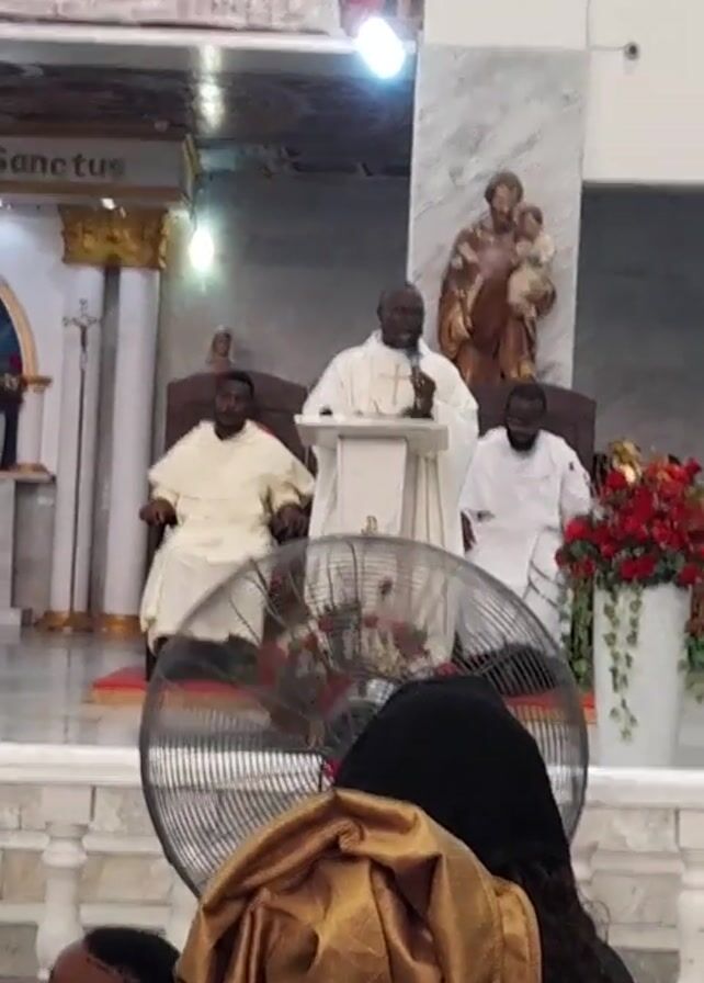 . The video shows the interior of a church during a service. A priest stands at a lectern, speaking into a microphone. Two other men in white robes are seated behind him. A fan is positioned in front of the altar. Behind the priest, there is a statue of Joseph holding the baby Jesus. Above the altar, there is a painting. People are seated in the pews, listening to the priest.