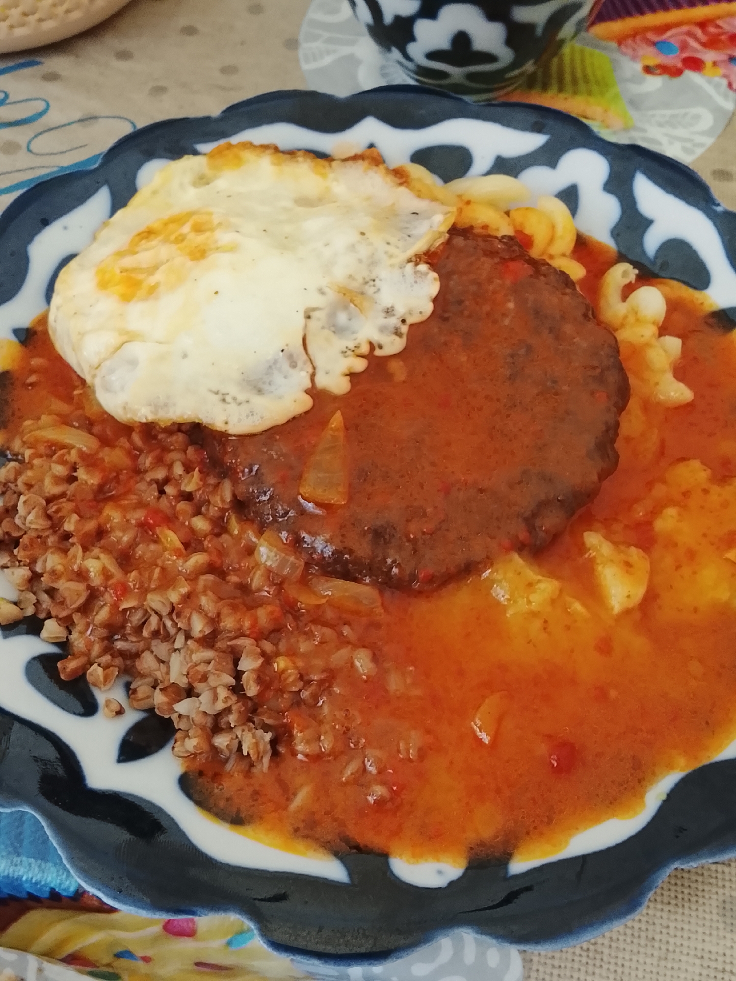 Here's a detailed description of the image: **Scene:** A plate of food is presented on a blue and white patterned plate. **Subjects & Objects:** * **Food:** The meal consists of a meat patty covered in a reddish-brown sauce. A fried egg sits atop the patty. The plate also contains portions of cooked buckwheat with sauce, and some macaroni. * **Plate:** The plate features a distinctive blue and white design. * **Background:** A table surface is visible in the background along with a cup. **Environment:** * The setting appears to be indoors, potentially in a home or restaurant. **Location Clues:** There is an item that is typically manufactured in Uzbekistan. It is an ornately decorated bowl that may be used for serving. The bowl in the image is of a similar design to the bowls that come from Uzbekistan, and that is the likely location of the image. Without more information, it is impossible to determine what the specific location is in the city of Syrdarya, Uzbekistan.