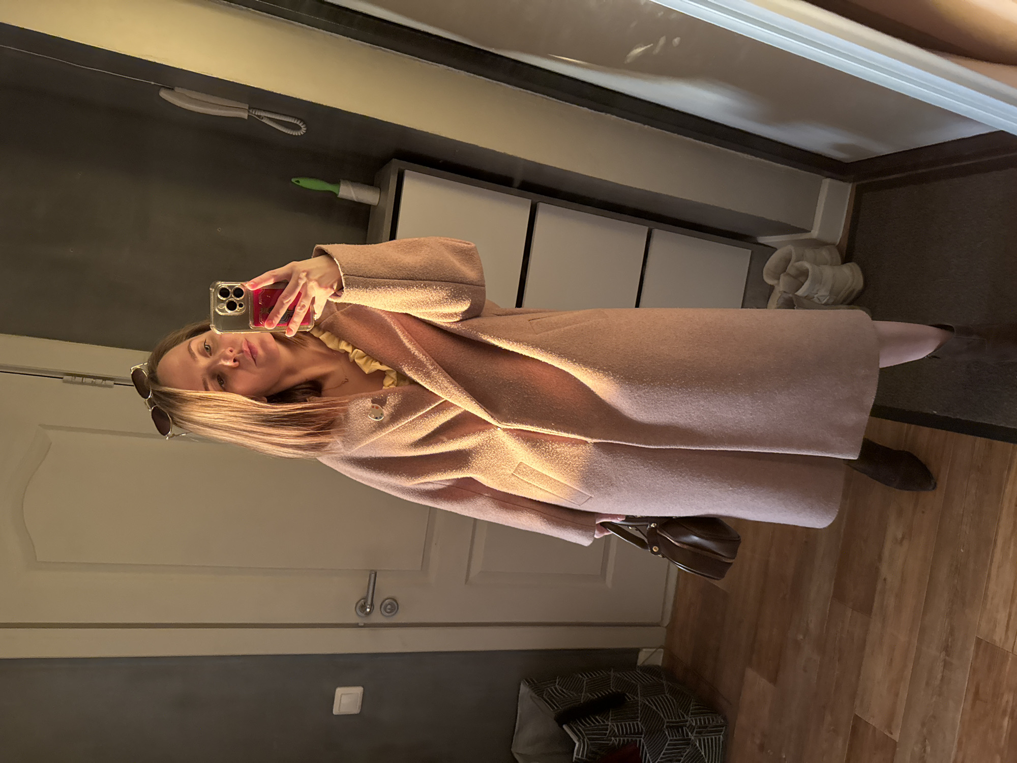 The image depicts a female subject taking a mirror selfie indoors, likely in a residential entryway or hallway in Perm, Russia. The subject is a light-skinned female with shoulder-length, light brown hair, wearing sunglasses atop her head. She is dressed in a knee-length, textured light pink coat over a yellow ruffled top and dark brown ankle boots. She holds a dark brown handbag in her left hand. Her right hand grasps a silver-colored smartphone, featuring a multi-lens camera array and a red card holder on its back, positioned to capture her reflection. Her expression is neutral, with slightly parted lips. The environment includes a dark gray wall on the left with a white light switch and a patterned fabric bin on the floor. A white interior door with a silver handle and lock mechanism is centrally positioned. To the right of the door, another dark gray wall features a white wall-mounted intercom unit with a coiled handset cord. Below the intercom, a light-colored, three-drawer storage unit is visible, with a green-handled lint roller resting on its top surface. Below this unit, a dark doormat covers part of the light brown wood-grain laminate flooring, where a pair of light-colored high-top shoes are placed. Strong, warm light illuminates the scene from an unseen source to the left, casting distinct shadows. The edge of the mirror used for the selfie is visible along the far right. No specific landmarks or unique identifiers are present to pinpoint an exact location within Perm.
