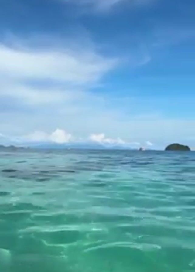 view from the water level of a tropical seascape. The water is a clear, turquoise color with gentle ripples. In the distance, there is a small, green, uninhabited island. Further away, there's landmass shrouded in mist. The sky is a bright blue with scattered white clouds. A boat is seen in the distance, moving across the water. The sounds of an engine can be heard.