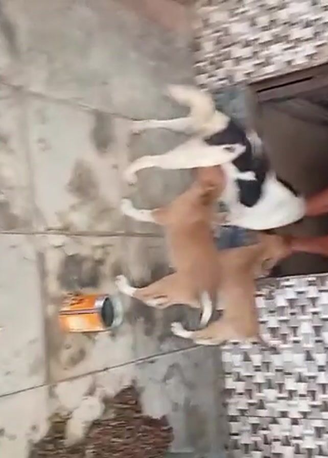 The camera captures a scene from a high angle. A person is lying inside a dark rectangular opening in the ground. They are wearing shorts and a pink shirt. Three dogs are gathered around the opening. One is black and white, and the other two are brown. The dogs seem to be looking at or interacting with the person inside the opening. Next to the opening lies an orange can. The ground is tiled, and there is some debris near the bottom of the frame.