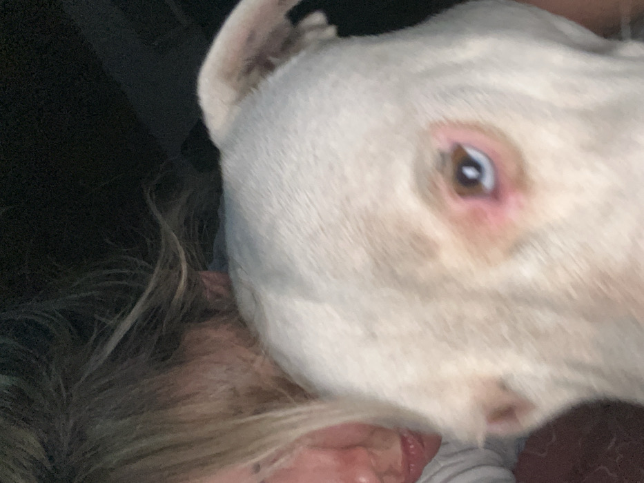 This close-up image, captured in Sumalao, Argentina, features a white dog and a partially visible human. The dog, positioned prominently in the foreground, exhibits short white fur and its right eye, characterized by a blueish-white pupil area and a darker iris rim, surrounded by reddish-pink skin. The top of its head and part of its right ear are discernible. To the left and slightly behind the dog's head, a person is visible, showing a portion of their face, including the cheek, mouth, and chin, framed by blonde or light-colored hair. The person's skin appears flushed. The background is dark and indistinct, offering no specific environmental identifiers beyond suggesting an interior setting with low light. The proximity of the subjects indicates a close interaction.