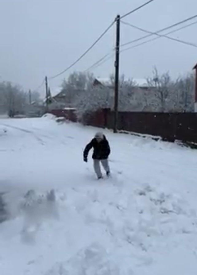person walking on a snowy road during snowfall, then falling into a snowdrift. The person is wearing a dark jacket, light-colored pants, and a hat. The surroundings are a residential area with houses and fences covered in snow. There are also utility poles with wires visible against the grey sky. The person falls face-first into the snowdrift.