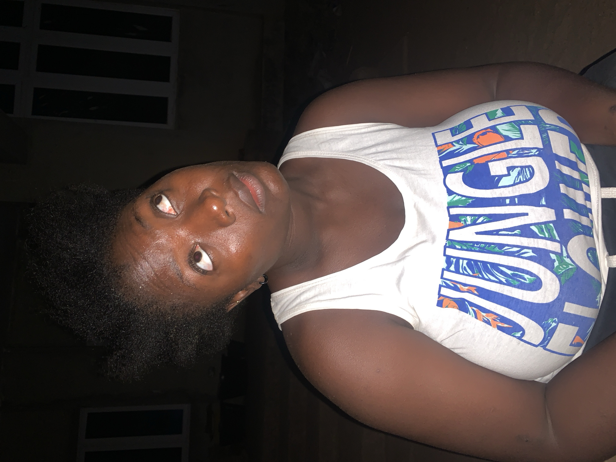 A medium-shot, low-angle image shows a dark-skinned Black woman facing the camera. She wears a white tank top with the word "JUNGE" printed on it. The location and specific context of the image within the city of Akwanga, Nigeria, cannot be determined from the provided image. The environment appears to be dark. Details in the background are indistinguishable.