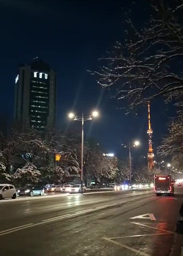 The scene is set on a wet city street at night, likely in winter, indicated by the light dusting of snow on the trees lining the road. Streetlights illuminate the area, reflecting on the wet pavement. Cars are visible on the road, moving in both directions. On the left side of the frame, a tall building is seen with the letters "NBU" illuminated on its side. In the distance, a tall, orange-lit television tower is visible, serving as a prominent landmark. On the right side of the frame, a person stands on the sidewalk holding a bag. Overall, the scene depicts a nighttime view of a city street in winter, featuring both modern architecture and natural elements.