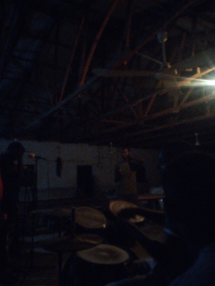 Indoors, a dimly lit space features exposed rafters with a ceiling fan. A band is performing; a figure stands at a microphone stand to the left, and another person is visible slightly behind and to the right. The foreground contains a steelpan, and a person's head in the right side of the frame creates the impression of them being within the audience. A dimly lit doorway and wall can be seen behind the band.