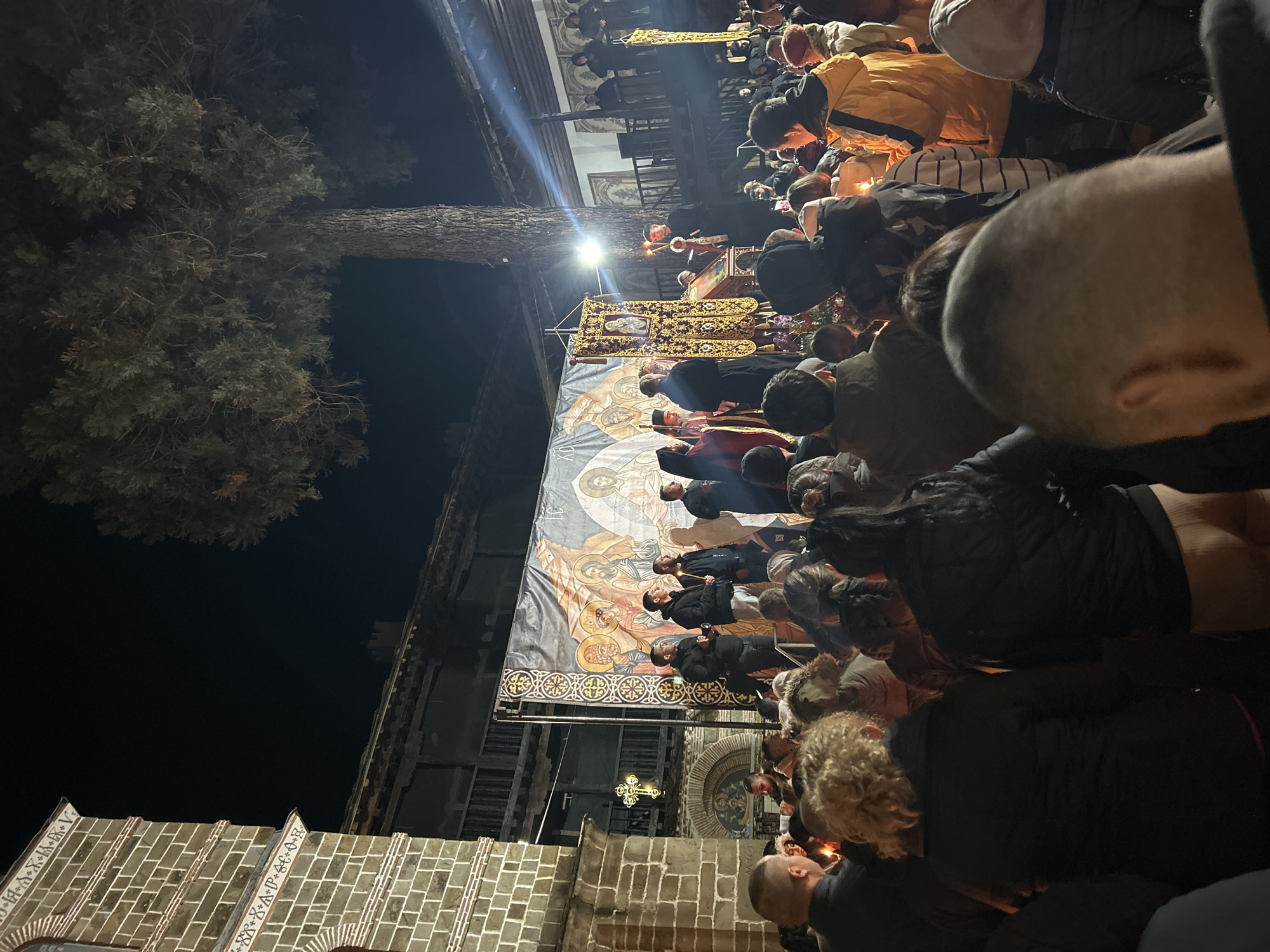 Here is a description of the image: The image shows a nighttime outdoor religious gathering in Oreshak, Bulgaria, likely at the Troyan Monastery complex
