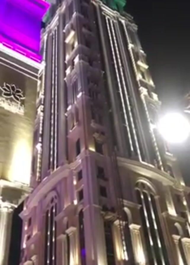 high-angle shot of a tall, ornate building at night. The building is illuminated with white and green lights, and appears to be made of a light-colored stone or concrete. The building has a classical architectural style, with columns, arches, and decorative elements. To the left of the building is another building with a purple light shining on it, and there is a street light to the right of the building. The sky is dark, and there are no people visible in the video.