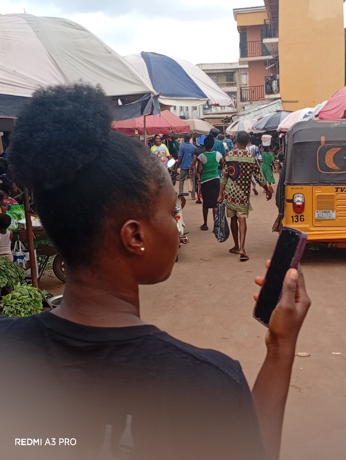 The image depicts a bustling outdoor market street scene in Akokwa, Nigeria, under an overcast sky. In the foreground, the back and right profile of a dark-skinned individual, likely female, is visible. She wears a dark t-shirt, has her dark, textured hair styled in a high bun, and a small, gold stud earring in her right ear. Her right hand holds a dark-cased smartphone upright, positioned as if recording or photographing the scene ahead. The lower left corner of the image contains a "REDMI A3 PRO" watermark. The midground and background reveal a crowded unpaved street, consistent with a market. Numerous people of various ages are walking or standing, dressed in casual attire. Notable figures include an individual walking away from the camera, wearing a distinctive green, brown, and white patterned shirt with circular motifs and carrying a dark bag. To the right, a yellow and black motorized trishaw, marked "TVS" and "136" with a partial license plate "VER-2000", is parked or moving slowly. Market stalls are identifiable by large, temporary umbrellas in shades of white, grey, blue, and red, providing shade for vendors and customers. On the far left, green leafy vegetables are visible on a low cart or display. Multi-story buildings, including one prominent light orange/yellow building with balconies and another lighter-colored building, form the background structures.