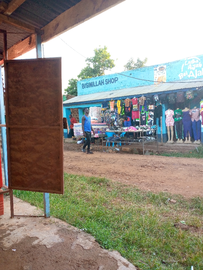 A street scene shows a blue building with "Bismillah Shop" painted on the front
