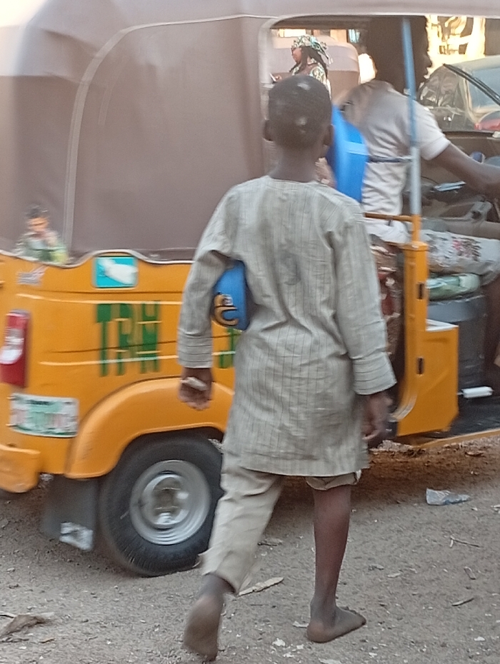 A young child walks barefoot on a dirt surface, wearing a striped beige tunic and mismatched pants. The left leg of the pants is full-length, while the right leg is cut off at the knee. A blue object is tucked under the child's left arm. Behind the child, a yellow auto-rickshaw is visible. The rickshaw has green lettering and a small doll-like figure attached to the front. People are seated inside the rickshaw, and a street scene unfolds in the background.