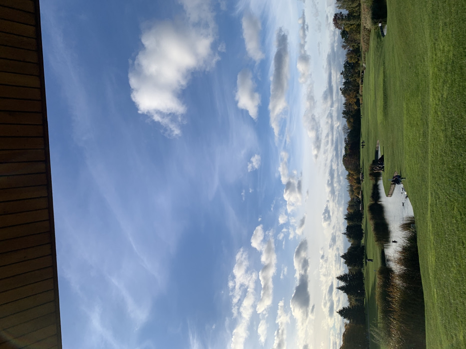 The image depicts a panoramic view of the Kozyn Golf Club, located in Novi Petrivtsi, Ukraine, under a partly cloudy sky. The scene is observed from under a dark brown slatted wooden overhang, which occupies the top approximately 5% of the frame. The sky, covering the upper half of the image, is a light blue with scattered white cumulus clouds and faint cirrus streaks. The lower half of the image showcases a well-maintained green golf course landscape. In the mid-ground, a dark, winding body of water, likely a pond or stream, runs horizontally from the left towards the center-right. Its left bank is lined with tall, dry reeds. On the immediate right bank of this water feature, a group of approximately five individuals are gathered. One person, wearing a dark jacket and blue pants, is crouched near the water's edge, close to two white swans, one in the water and one partially on the bank. Other individuals are further back on the bank. Beyond the water, the green grass continues, dotted with several dark figures, estimated to be 8-10 people, walking or standing in the distance across the golf course. Clumps of evergreen trees, primarily conifers, are visible on the left side and in the far background, interspersed with deciduous trees displaying autumn foliage with hues of green, yellow, and orange. The overall lighting suggests natural daylight, possibly late afternoon, with soft shadows visible on the grass.
